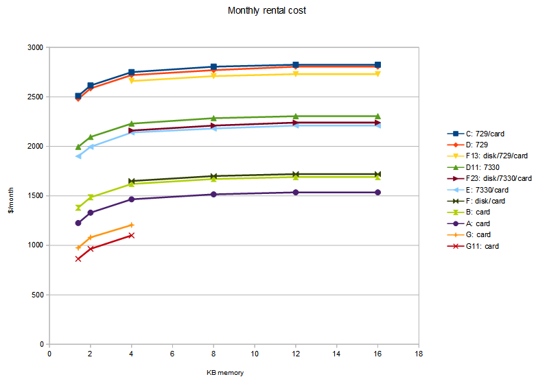I made a graph of the 1976 rental prices in Jeff's attachment. The pricing scheme is interesting, but a bit puzzling. Basically, the price is determined by the memory and tape drive type; other things don't really matter.