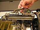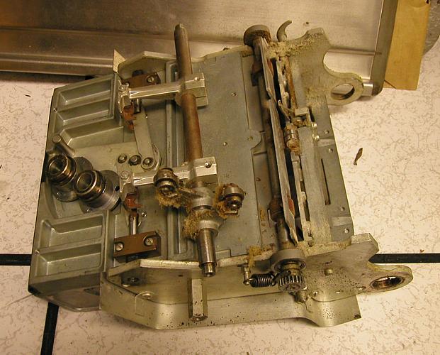 - RobertRobert & I agreed that evaluating the bearings in one of the 1402 assemblies made sense, so I picked up the (what I will call) "card punch feed picker shaft and shoes" which is one shaft with two arms with captive bearings and two pick shoes with what appear to be carbide inserts offset by the (guess) thickness of one card, and the support bearings for each end of the shaft. The shoes are pretty rusty on top, but the functional surfaces look ok. The shaft is mildly rusty, but this has no impact on functionality. My plan is as follows:
