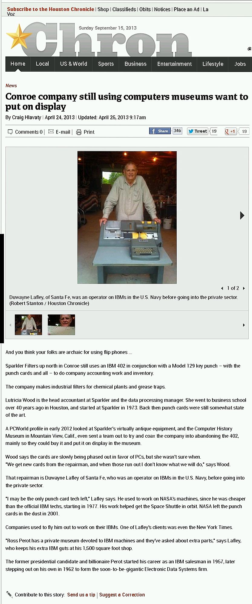 Our purpose was to meet the folks at Sparkler Filters and charm them into giving up the 402 by suggesting they transfer the jobs it is doing to more modern equipment So Stan Paddock, Ed Thelen and I booked flights, a car and motels for the trip. Ron Crane planned a trip to overlap with our meeting. Stan contacted Duwayne Lafley (the guy who serviced the 402 and other machines in the account) he came up to meet us there. It was a good thing because the 402 had a really bad jam that the operator was unable to remove. We had a good meeting, demos of the 402 and a tour of their plant where they make filters for any type of liquid. We met the owner and I believe the general manager of the company, Jim Reneau. He seemed to have no problem with giving up the machine if the work it is doing would not be disrupted. I think they will let us have the machine for the CHM If we stay in communications with them.