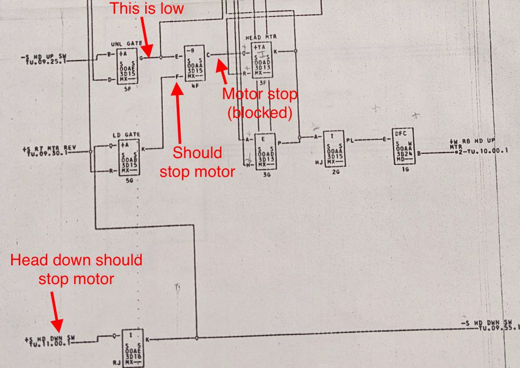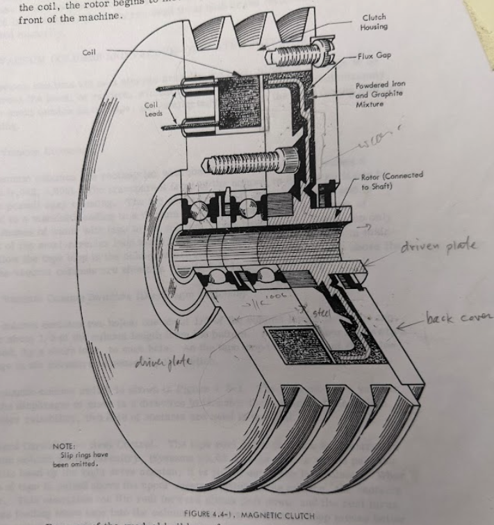 Our conclusion is that the brake clutch is at fault. Each shaft has three clutches: one to rotate forward, one for backward. , and one to stop motion. The forward and backward clutches work fine, but the brake clutch seems to be getting stuck. The clutches are magnetic, with iron/graphite powder that binds the clutch plates when the coil is energized. So it's unclear what would cause the clutch to stay engaged with no power applied. Maybe Iggy has some ideas? ![]()
