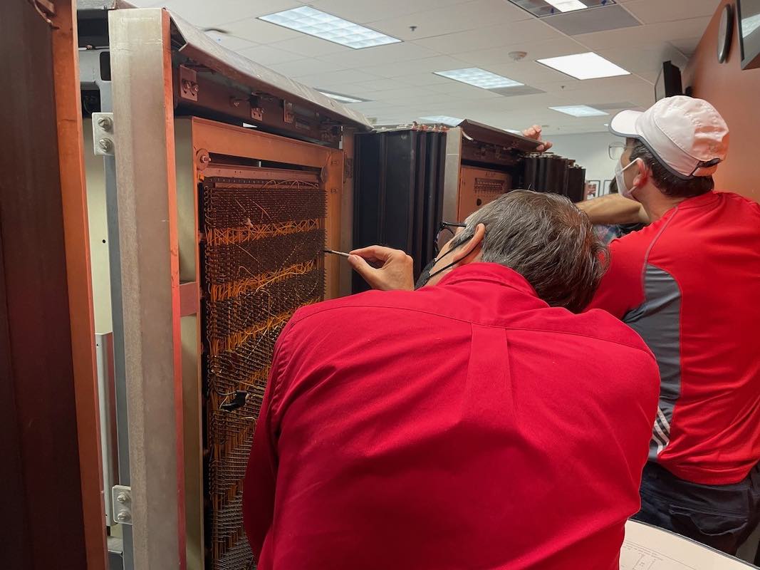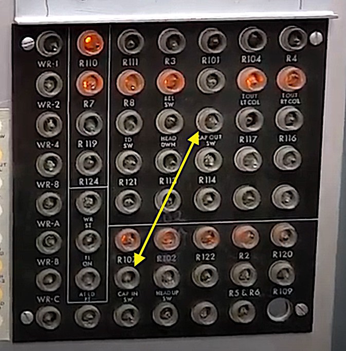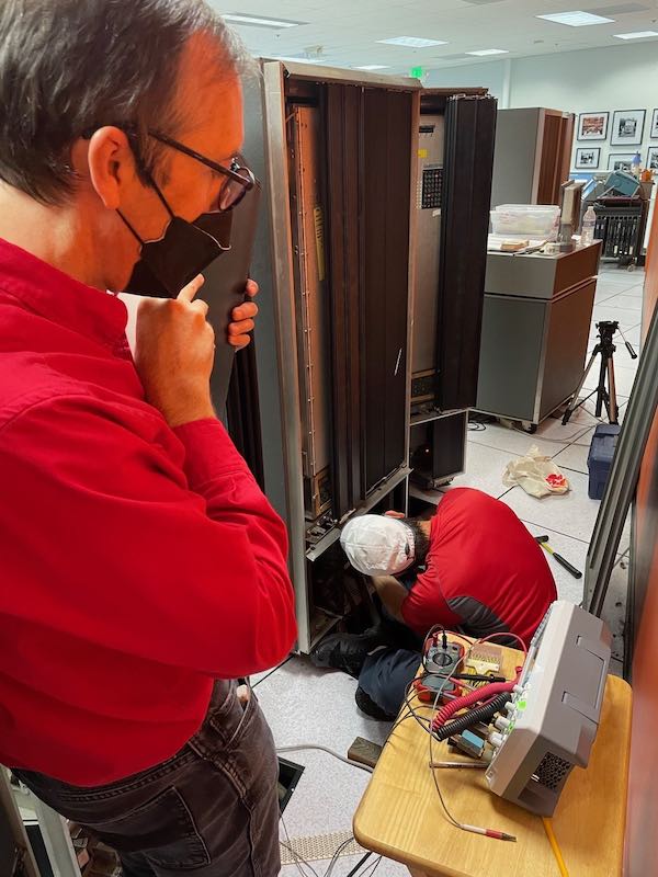 Brenda and I worked on the 729 and made negative progress :-) We fixed DE 729 #1 a couple of weeks ago by replacing relay #119. However, the drive failed again, refusing to load. Brenda tested relays and didn't find a good one so she disassembled one and tediously cleaned the wires. We put the cleaned relay in the 729 and it still didn't work. I swapped relays #119 and #120 (which caused the drive to work last week) and the drive still didn't work. So I'm suspicious that the drive has encountered a new problem. Brenda is making a relay extender so we can probe the relays and see what is happening. We also looked at a bad light on the DE TAU control console: the register B bit A light doesn't illuminate. Brenda replaced bulbs last week, fixing one failed light, but B bit A still didn't work. We probed the SMS cards with an oscilloscope and found that the driver card is not getting a signal, so the problem is in the TAU circuitry, not the bulb. The demos were starting, so we will continue the investigation next week.