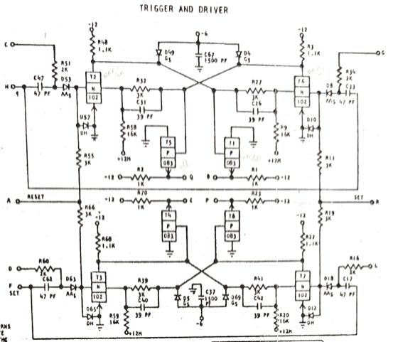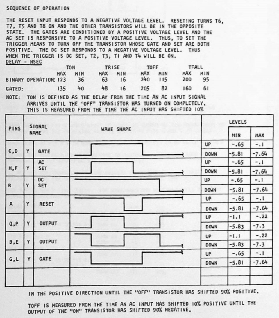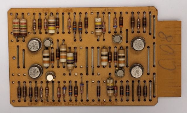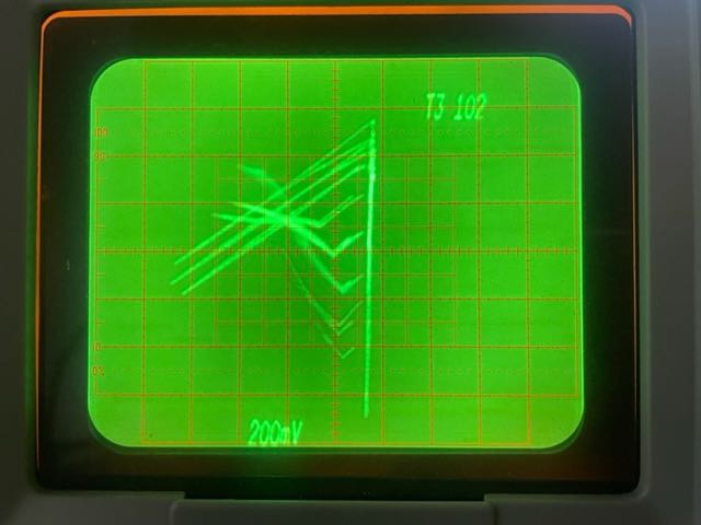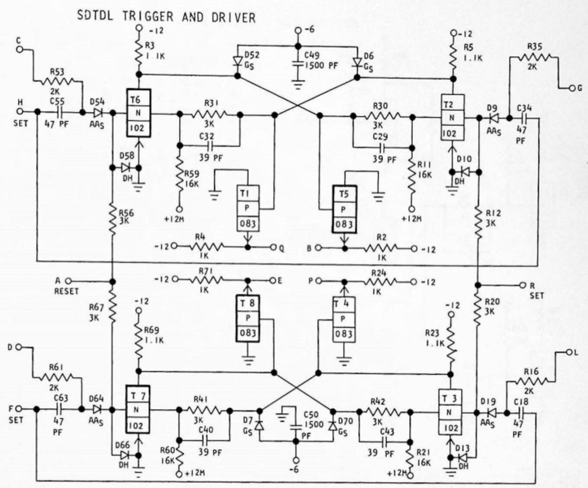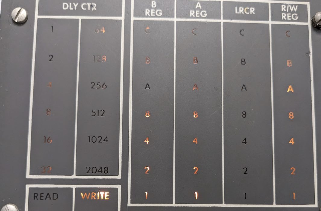 On the oscilloscope, the signal levels from the drives vary widely from 4.88V p-p to 8.16V. The A bit is in the middle at 5.84V, so that doesn't seem to be the issue. The signal goes through a DZA amplifier/clipper card and the low output looks maybe .5V lower than the others, but it's hard to tell if this is the problem. Next, the signals go through YCC peak detector/integrator cards. This is generating spike signals but they look 4 volts too weak. Later in the processing chain, the low A signal disappears entirely and the light doesn't light.