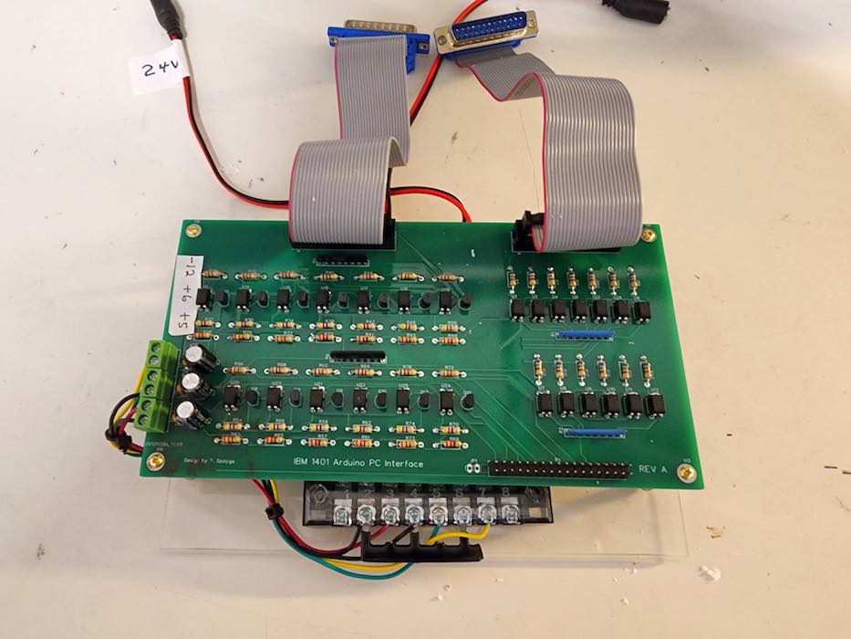 In the workshop, Tom continued designing and assembling his Arduino-based interface to the 1401’s serial I/O port, photo below: