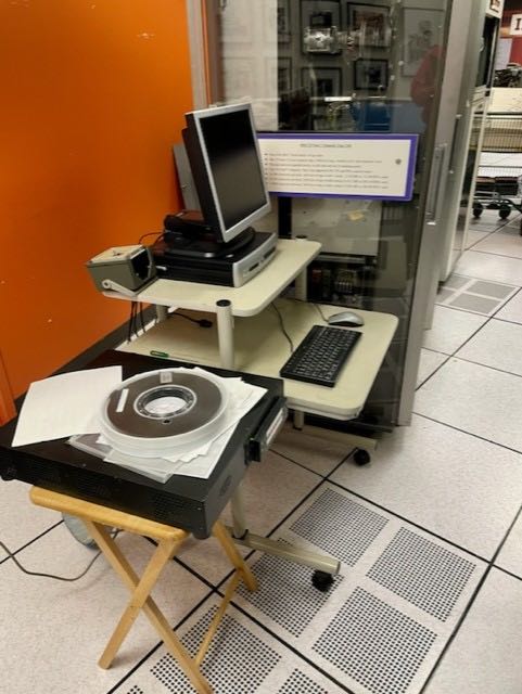 Hi Robert, Before the power went off I made some progress on the tape emulator system. First I learned what TAU stands for and how to use the 1401 TAU to control the tape drives. Next I learned how to power up the emulator system, which app to run, and how the app works. Powering up was a project because there were 3 plug strips, daisy chained around the Connecticut machine’s memory going to a plug box under the floor attached to a breaker that was turned off. I learned how to connect it to the tape drives and which connectors to use. This was new knowledge—no one knew the answer. Unfortunately, the capstan on the third German machine tape drive started to stick. The drive started working again just before the power failed so I was not able to transfer data.