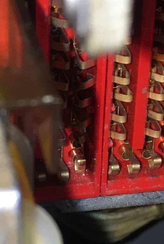 After reinstalling the brushes; no difference was observed. So, we went to replace relay #12 with a known good relay. Unable to obtain a known good relay, we set out to quickly clean one. The pins look great all shiny: