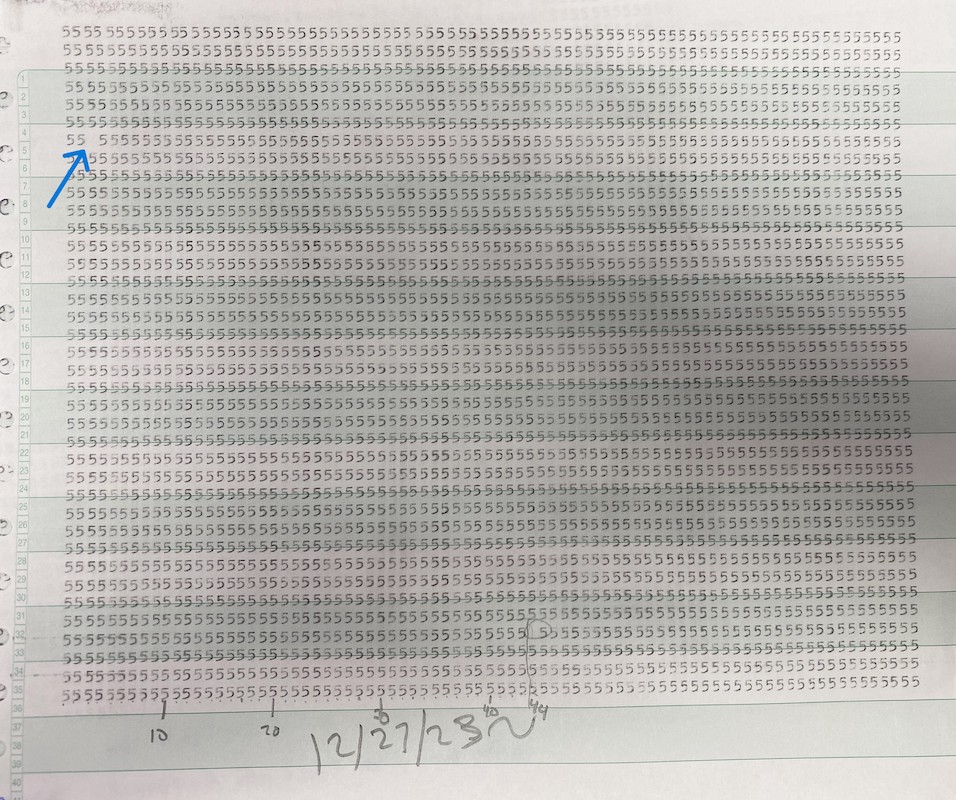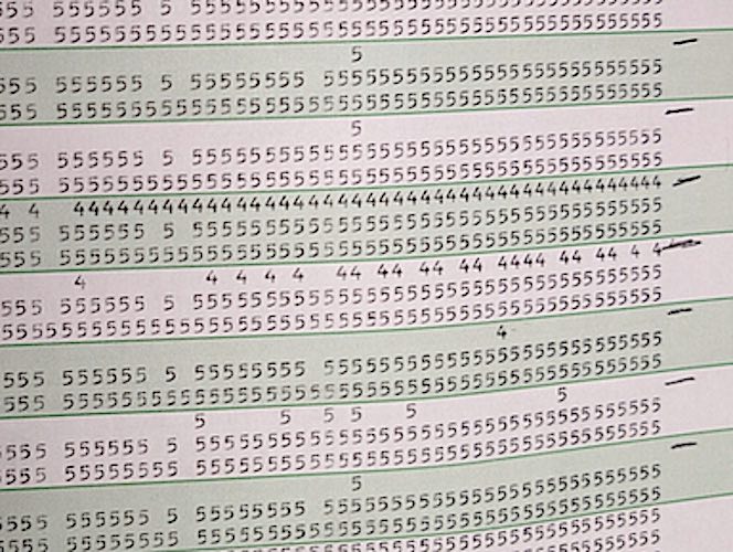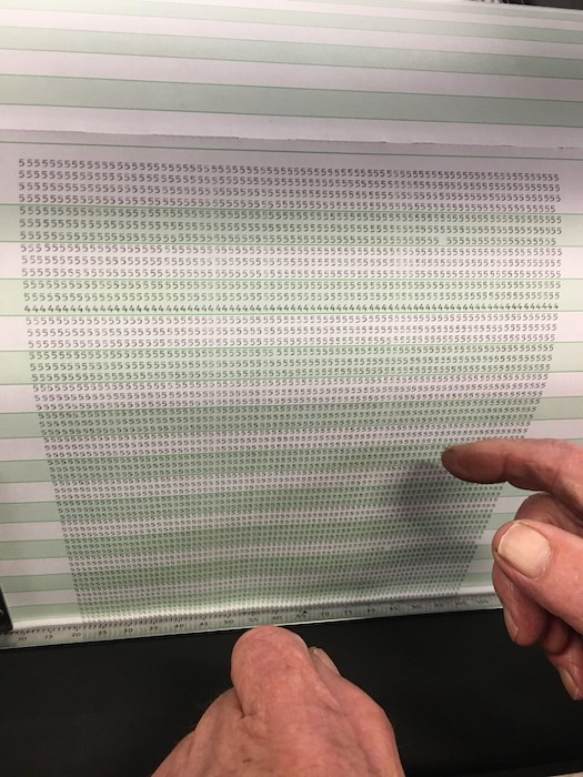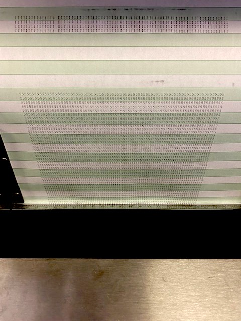 After some extensive work checking the resistance of each brush on a makeshift contact roller, the read brushes were reinstalled and an `All 5's` deck was printed. Read brush #3 still exhibited some missing data. Good news, however, is that all the rest of the columns continue to print perfectly.