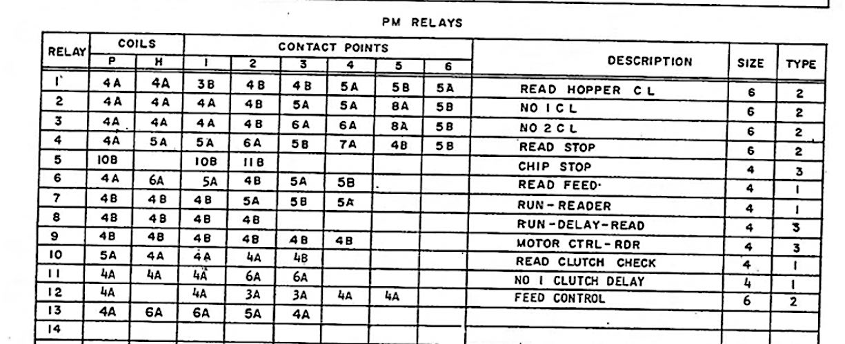 Our 1402 uses Permissive Make relays with 20-volt coils, which are color coded Yellow. The reader punch at Yosemite, we use for spare parts, uses 48-volt coils.