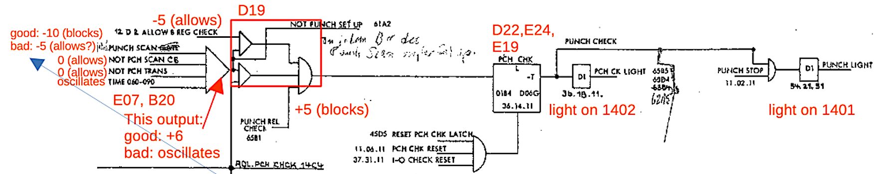 The DE #1 tape drive was unexpectedly working today after its intermittent problems. Apparently, Frank has the magic touch and restored it to operation, David and John are investigating two neon bulbs that aren't lighting on the back panel. I looked into the TAU problem with the B register A bit light not lighting. (This corresponds to the "low" A bit signal.) This happens with multiple drives, so it's a TAU issue, not a drive issue. I traced the signals and the problem appears to be early in the signal processing. This problem is likely to cause bad data when reading so it's worth fixing.