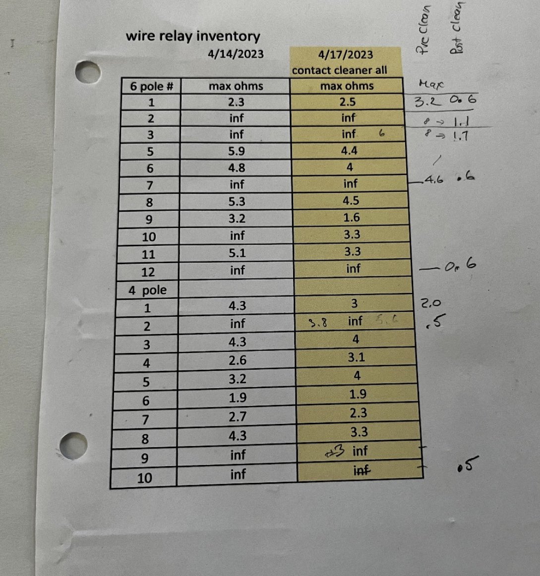 Our QA procedure for these relays is yet to be determined, one idea is that a contact resistance of 5 ohms would be reasonable. Only 7 of this group of relays were above 5 ohms and cleaning them was effective.