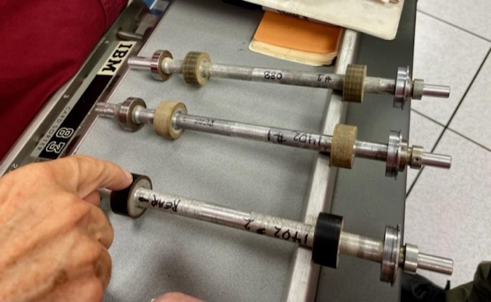 - I cleaned and lubricated all of the capstan bearings in all seven tape machines. It turns out that these bearings have little oil cups that all needed filling. John and I focused on DE#3 that had a particularly sticky left bearing. Inspection of the shaft revealed what looked like a tiny ding that I was able to polish out with 2500 grit emery followed by careful cleaning and lubrication. The sticking seems to be fixed, but is something to continue to watch out for.