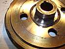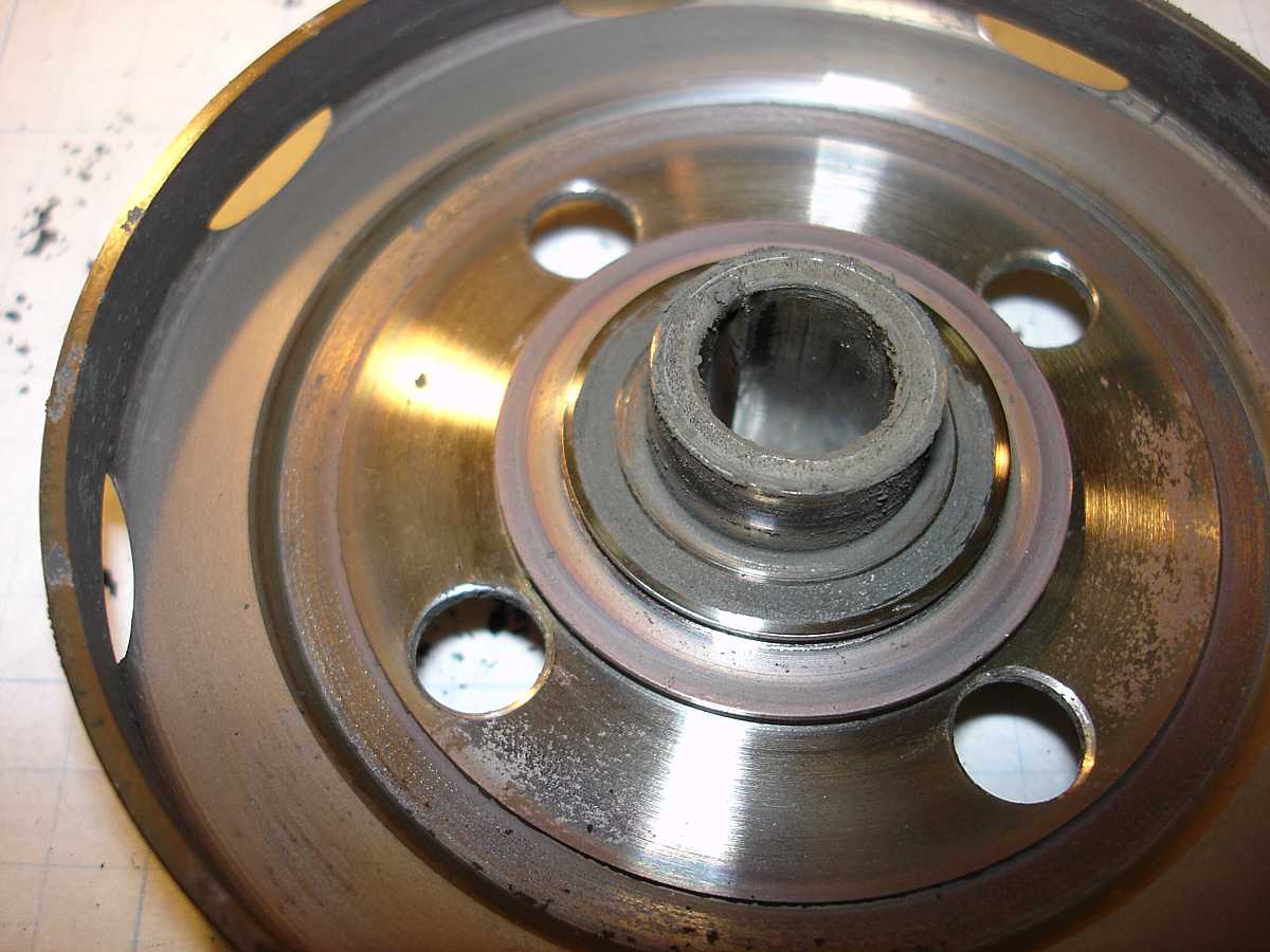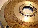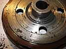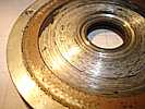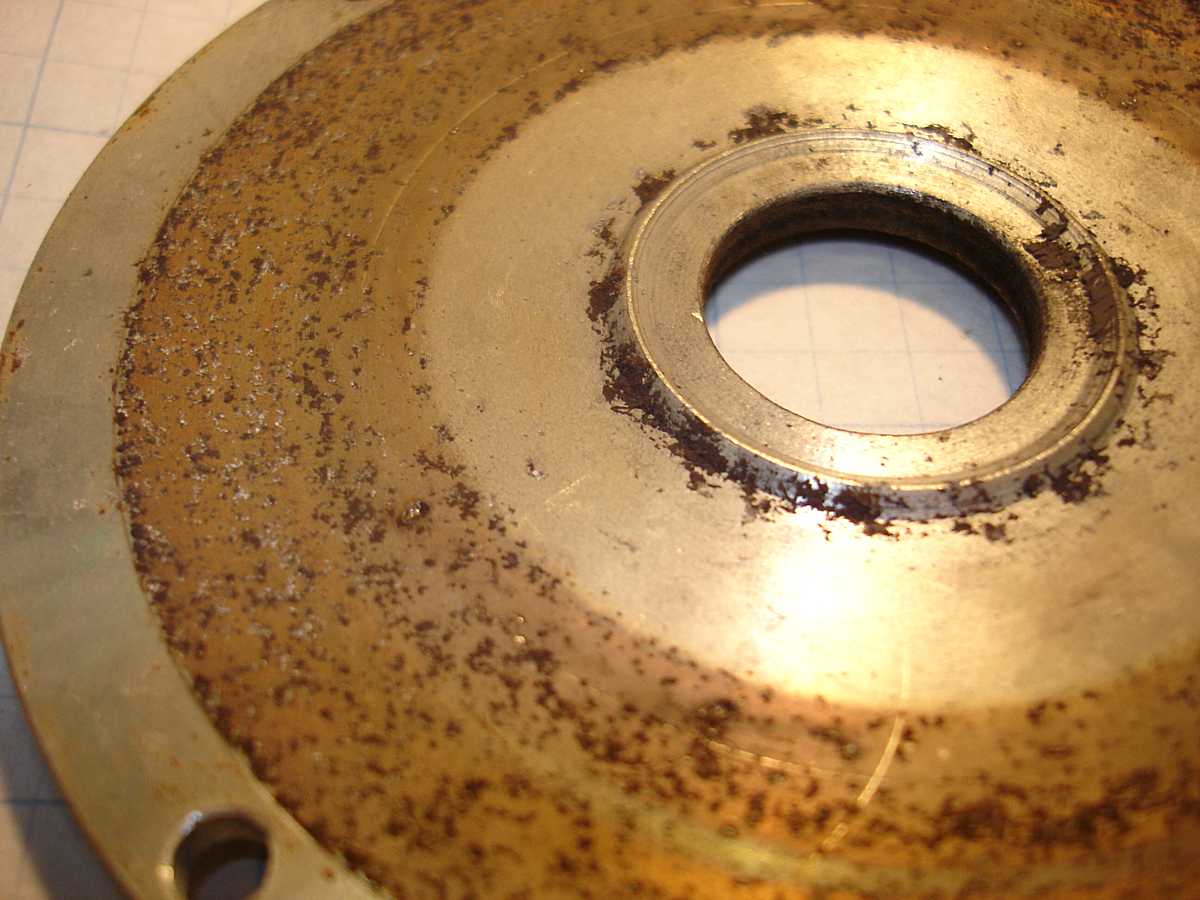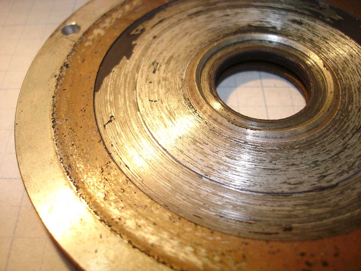 Gear clutch driven plate, note small balls of metal adhered to the intermediate disk surface. Some corrosion is present. As removed and powder brushed off. Gear clutch cover, inside surface. No wear but many small metal particles adhered. Brown is surface discoloration, no build up. Cover plate, center clutch. Note severe wear from contacting the driven plate. Compare to gear clutch cover. Wear depth estimated at 0.030" Driven plate, gear clutch. Note no wear on diameters adjacent to the shaft housing. Driven plate, center clutch. Note severe wear from contacting the cover. It appears that this plate was offset by the coil note being fully set into its housing and the armature plate (held with 4 bolts) not fully seated. The coil mislocation appears to be a manufacturing defect. Gear clutch driven plate. No wear but there are multiple small dings in the surface of unknown origin. Some small metal balls are present. Perhaps a small metal particle is loose in the powder and is making contact between the cover and this plate on occasion. Slip rings, not sure which clutch. Both appear to be in excellent condition. Further disassembly requires mucking with the coil leads and I would not recommend it. Gear clutch driven plate, closeup of dings. Gear clutch on left, center clutch on right. Top is cover, center is criven plate, bottom is driver assembly. Center clutch driver assembly without powder (bottom right). >Felt seals, left from gear clutch, right from center clutch. Material appears to be medium density wool felt.