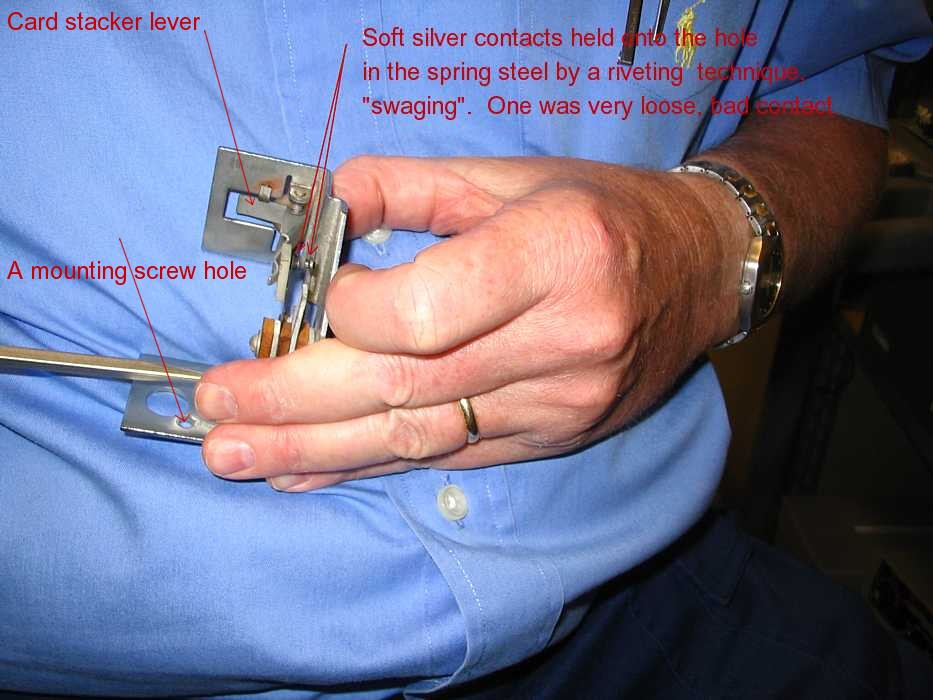 - Bill Flora and Don Cull found the card stacker lever contact closure had erratic resistance. (The resistance should be essentially zero or multiple megohms. They were measuring 10, 20, hundreds of ohms - varying all over the place.) They burnished the contacts again and it still misbehaved.