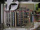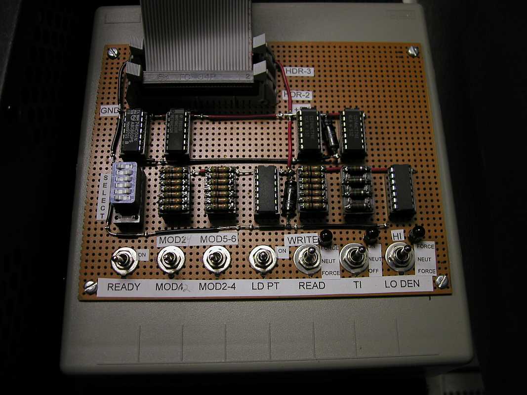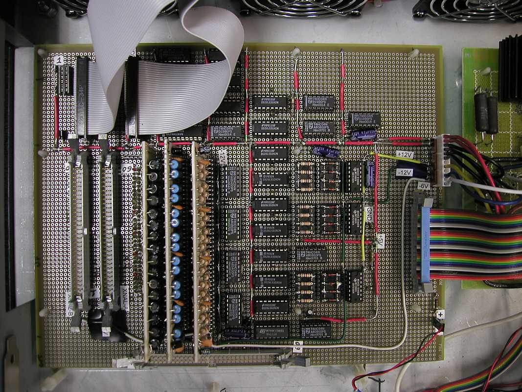 Bob Feretich also plugged in the almost complete TAU-Checker/Tape-Unit-Emulation box and checked some functions. Note the ribbon cables connecting to the 1401 Tape Cable Plug.