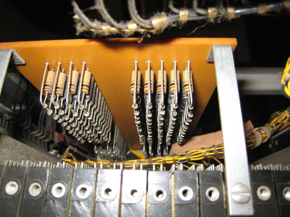 Mid 2006, the 1401 and 1406 (extended memory) was working well enough for Ron to determine that the top 8,000 character memory stack had a periodic single bit error that was not caused by a bad logic card - likely an open core stack half select wire - :-(( - There are other problems in that core stack, see here.Sept 1, 2006 - Bob Feretich and Ron Crane got down and under the low 1406 unit and probed with an ohmmeter and determined which terminal in which core plane was showing open. By great good luck, it was the bottom plane - most easily damaged, and most easily accessible.