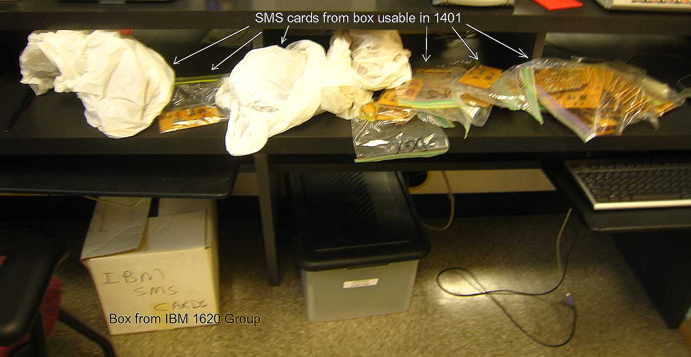 - Some one brought in a big box of SMS cards with a note from the IBM 1620 folks that these cards are not used in the 1620. The current list of cards used in the 1401 and 1406 did not include cards used in the 729 tape drives. Ed Thelen got a list of 729 cards and compared the lists with the contents of the 1620 box. We use about half of them - unfortunately, non of the cards are for the 729s - for which we have no spares.
