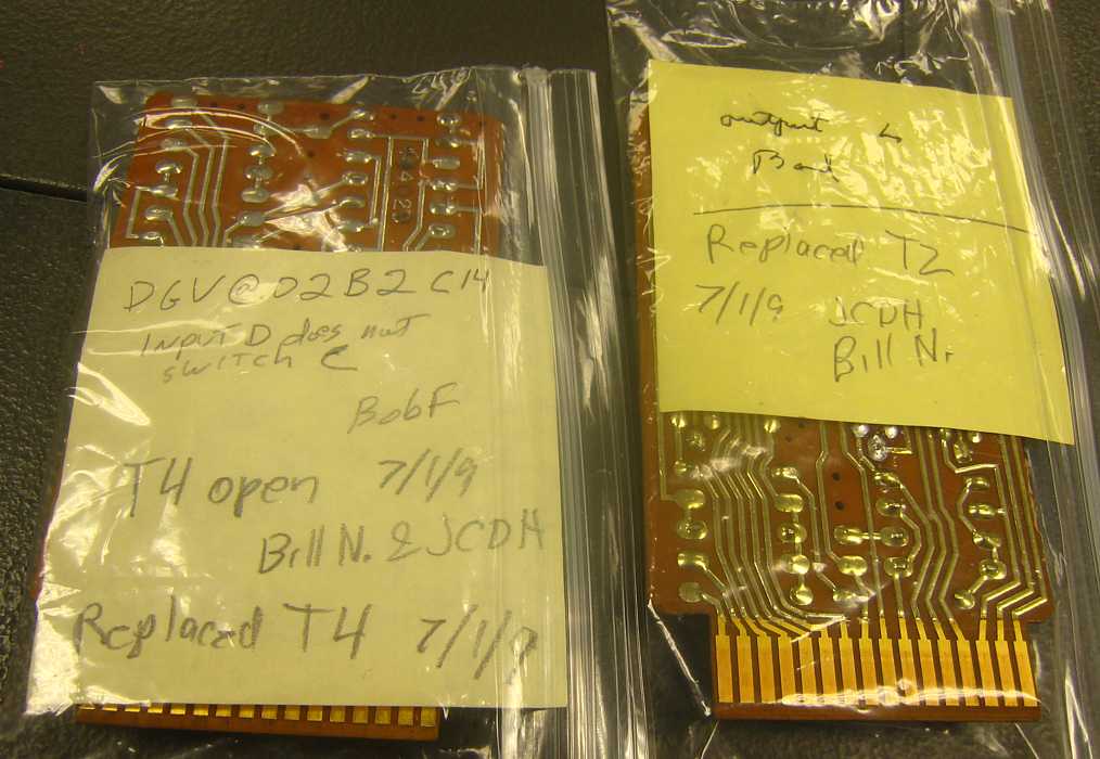 (George Ahearn and Stan Paddock had come in Monday (above) to docent 60 of Ron Mak's students - but since we are not paying double time for over time ;-)) they didn't appear today.)- Jim Hunt fixed 11 SMS cards - 9 bad transistors, 1 open 56 uH inductor, 1 GE point contact diode. We are running out of selected types of spare transistors. Off to the Internet for more equivalent types.