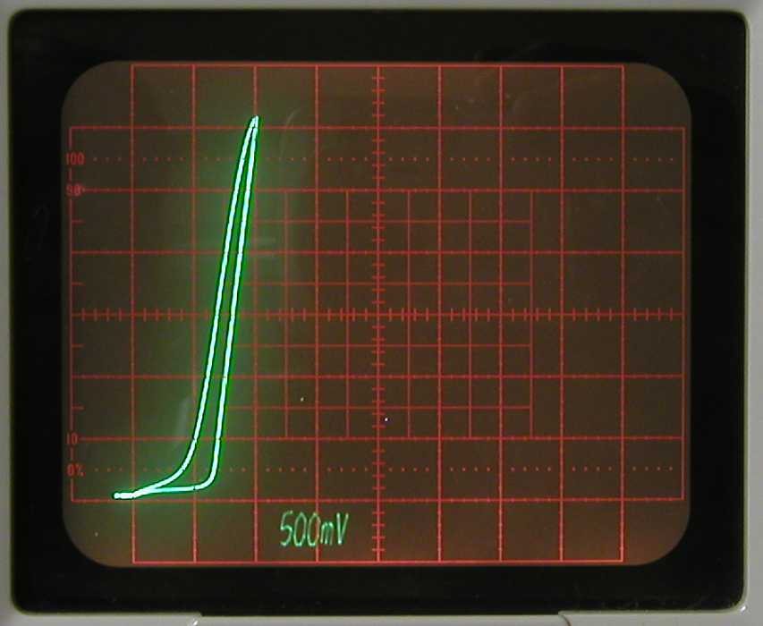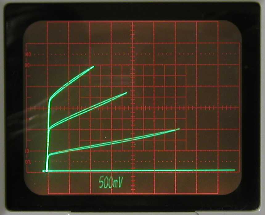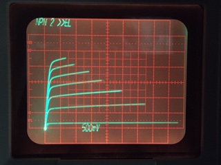 The original design in the magazine used +-1V peak to avoid possible damage to semiconductors during in circuit test, but this is too small to turn on darlington transistor E-B junctions so I increased my design to +-2V. I also added a +-10V peak range to check reverse breakdown, low voltage zeners, and operate transistors at higher voltages. All the 1401 testing has been done on the +-10V range, as this seemed more "realistic" to me and I was having problems getting good Beta estimates on the +-2V range (due to an effect mentioned below almost all the transistors read very low Beta on that range, but more normal Beta on the +-10V range). The scope was not set to 1V/div. I usually use 0.5V/div when using the +-2V range and 2V/div when using the +-10V range (so the curve fits the screen better). Unless I need to determine transistor type (Si/Ge) or breakdown voltages I'm more concerned with shape than exact voltage/current levels.