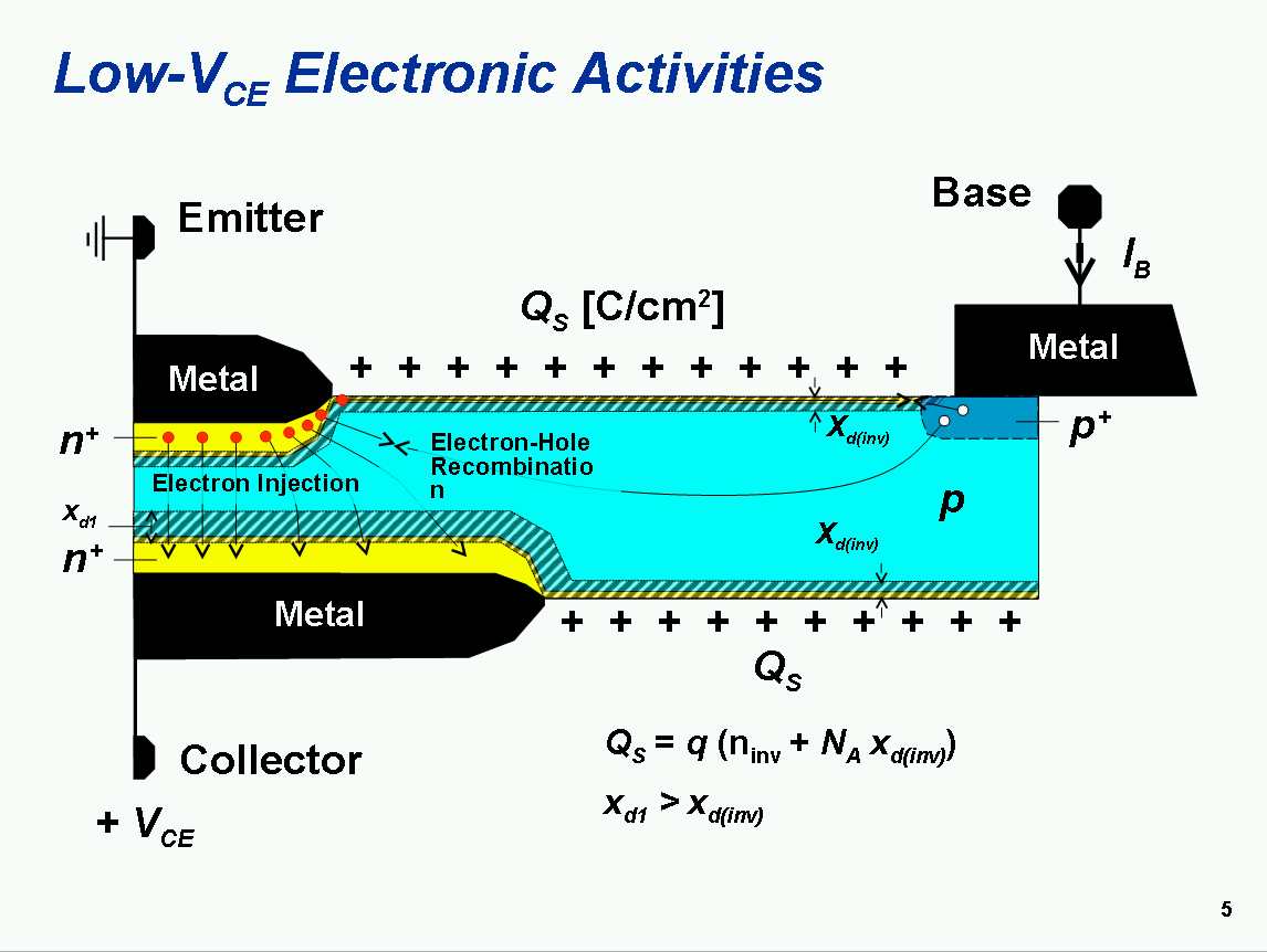 We need to think through the effect of an accumulated, depleted, or inverted surface on transistor behavior. That includes the emitter being expanded by an inversion layer which would become more conductive and inject carriers during forward bias of the EB junction. When the transistor is turned off, the inversion layer might be partly or fully cut off from the inversion leaving the inversion still emitting. This would also be a region of the transistor where the carriers take longer to get to the collector. I believe this explanation is in the literature, but don't know where to find it. It may only have been an oral paper and never published on paper.