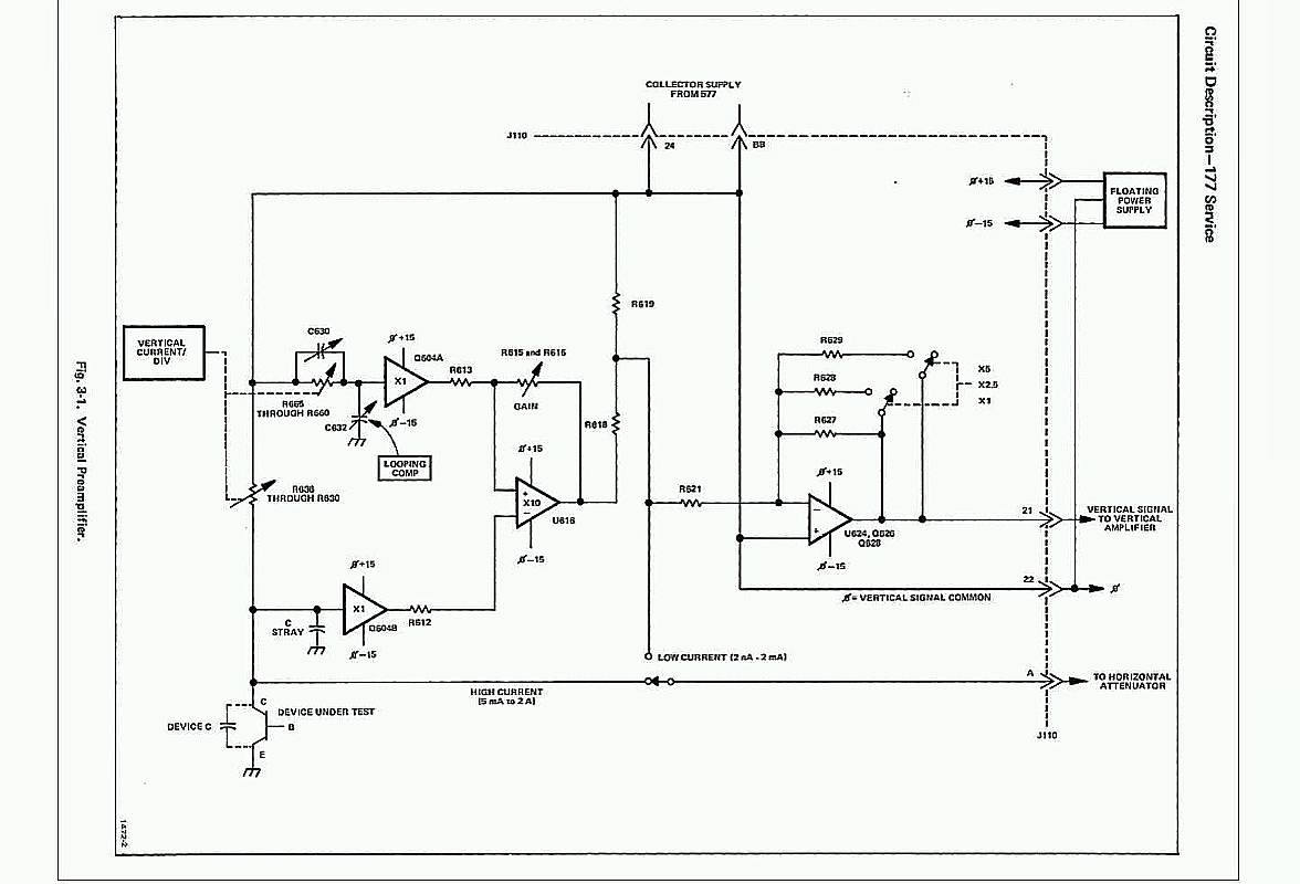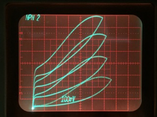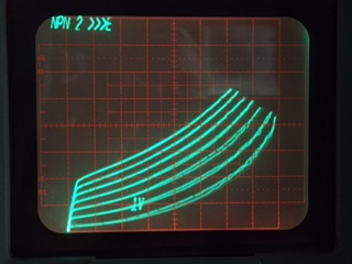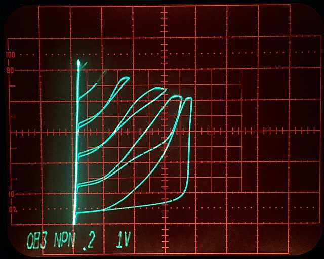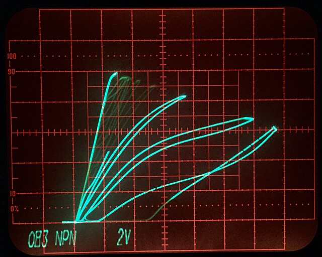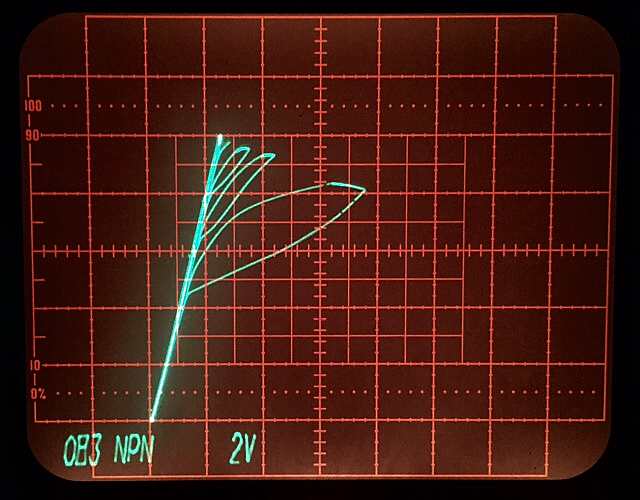 The Beta settings use an additional similar resistor network to inject current thorough the Emitter-Base junction while the main circuit is measuring the characteristics of the Emitter to Collector path (similar to the O-B measurement, but with the Base connected instead of open). The difference in the additional similar network is that the 1K resistor is replaced by a Beta*1K resistor (50K, 100K, and 150K in my box) and there are no scope connections to that circuit. To a first approximation, if the resistor selected exactly matches the Beta of the transistor then the curve drawn will be identical to the curve drawn in E-B mode, if the resistor selected is larger than the Beta of the transistor the curve drawn falls outward, if the resistor selected is smaller than the Beta of the transistor the curve drawn pulls inward. However this is never exact as the test circuit has no compensation for the E-B diode characteristics (a second approximation effect that changes between transistor types) and the curve sometimes begins falling outward then pulls inward.