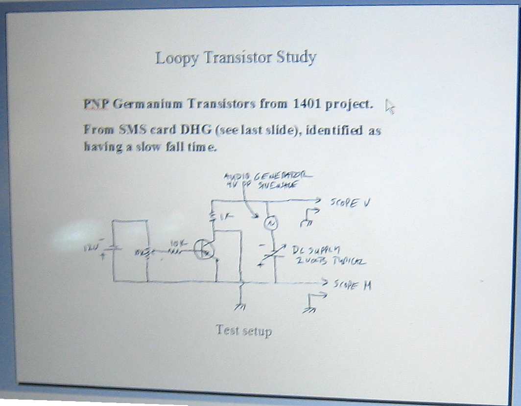 The 1401 transistors were germanium, although at the end of the SMS days, silicon transistors were found that could be used as substitutes in most cases or at least replacement boards were made with silicon transistors that were voltage and signal level compatible. The mode of loopy behavior in the silicon mesa transistors is similar to germanium. Mesa transistors had the collector diffused into the silicon over the entire wafer. The emitter was produced by a second diffusion or an alloy process (micro-epitaxy) and the emitter and base connections were covered with wax (or later photoresist) and were protected from an etch which went through the collector junction leaving the emitter and base on a tiny mesa of silicon. These junctions had no oxide protection except for the extremely thin native oxide and were sensitive to surface contamination as were the germanium emitter and collector junctions. The cans that transistors were put in or the plastic encapsulation of low cost transistors were to provide a hermetic seal and protect the sensitive collector junction. Contamination inside the can or any leaks resulted in leaky transistors.