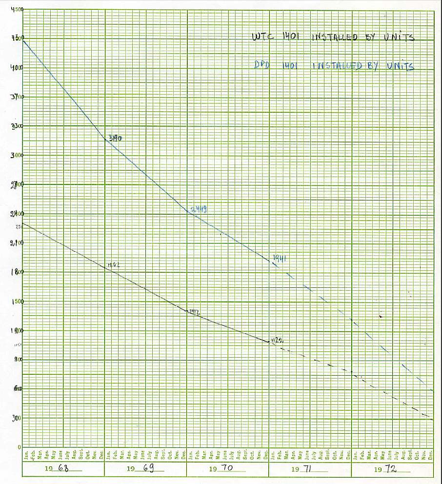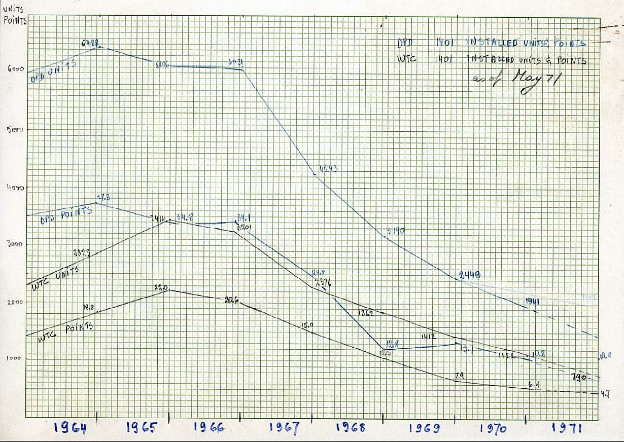 points were the usual maketing mesure.. no idea of split between minimal and complex systems. I am pretty sure however that the numbers are for the 1401 central unit alone since the printer/ tapes etc.. were accounted under their own number and since the 1401 had few options the average should be enough to understand the market penetration.... charts came from the US for a simple reason, they are draw on a chart paper which was not in use in Europe!